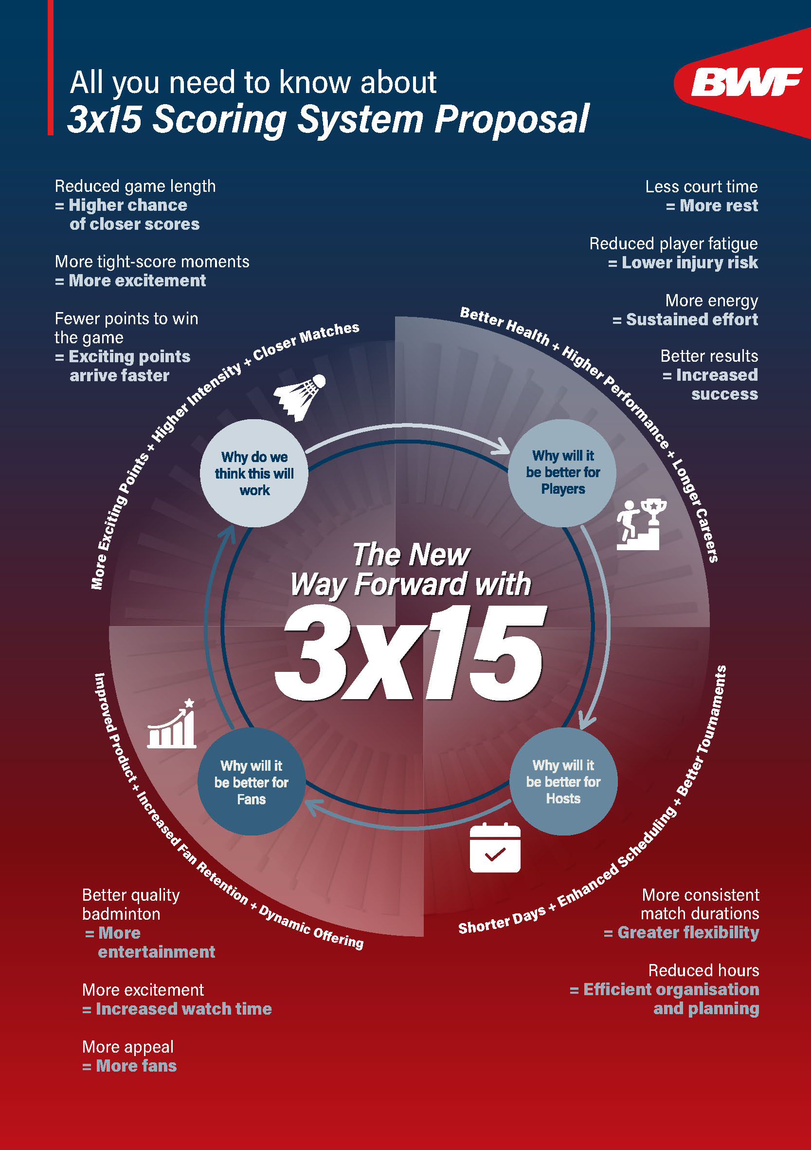 According to a BWF research, the 3×15 format offers several advantages compared to the current system: